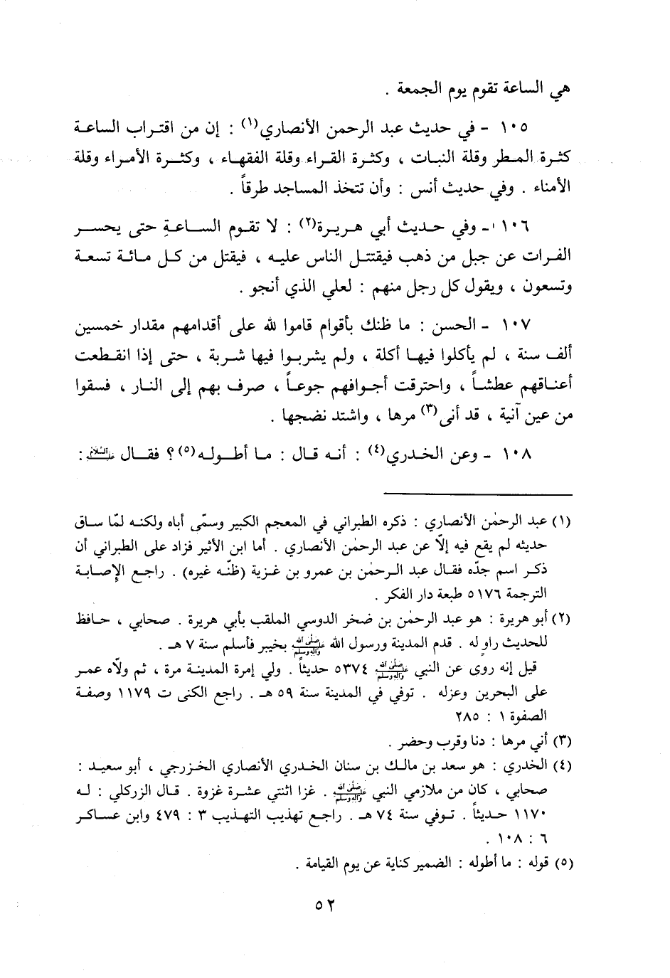 105- في حديث عبد الرحمن الأنصاري «1» : إن من اقتراب الساعة كثرة المطر وقلة النبات، وكثرة القراء وقلة الفقهاء، وكثرة الأمراء وقلة الأمناء. وفي حديث أنس: وأن تتخذ المساجد طرقا.