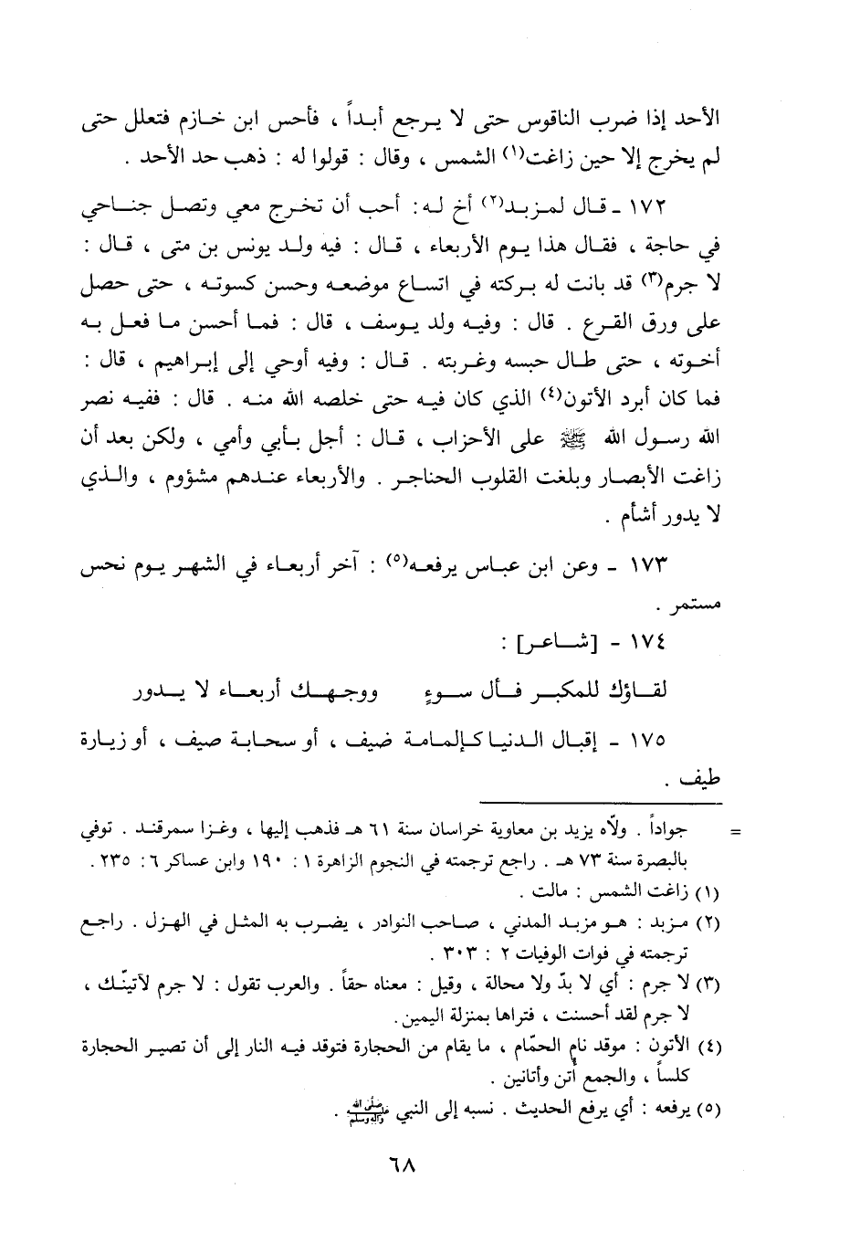 172- قال لمزبد «2» أخ له: أحب أن تخرج معي وتصل جناحي في حاجة، فقال هذا يوم الأربعاء، قال: فيه ولد يونس بن متى، قال: