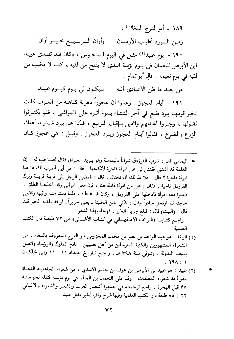 190- يوم عبيد «2» مثل في اليوم المنحوس، وكان قد تصدى عبيد ابن الأبرص للنعمان في يوم بؤسة الذي لا يفلح من لقيه، كما لا يخيب من لقيه في يوم نعيمه. قال أبو تمام: