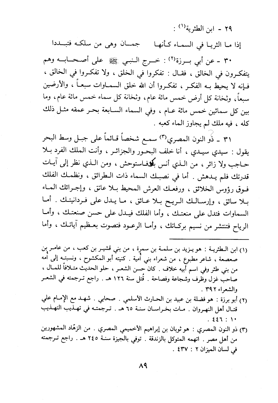 30- عن أبي برزة «2» : خرج النبي صلّى الله عليه وسلّم على أصحابه وهم يتفكرون في الخالق، فقال: تفكروا في الخلق، ولا تفكروا في الخالق، فإنه لا يحيط به الفكر، تفكروا أن الله خلق السماوات سبعا، والأرضين سبعا، وثخانة كل أرض خمس مائة عام، وثخانة كل سماء خمس مائة عام، وما بين كل سمائين خمس مائة عام، وفي السماء السابعة بحر عمقه مثل ذلك كله، فيه ملك لم يجاوز الماء كعبه.