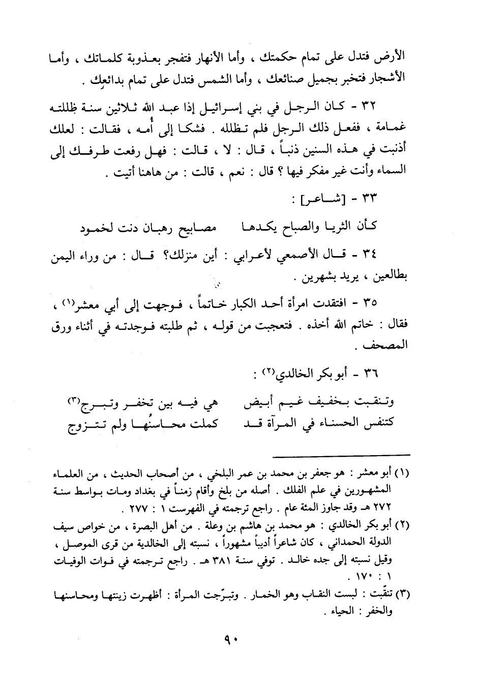 35- افتقدت امرأة أحد الكبار خاتما، فوجهت إلى أبي معشر «1» ، فقال: خاتم الله أخذه. فتعجبت من قوله، ثم طلبته فوجدته في أثناء ورق المصحف.