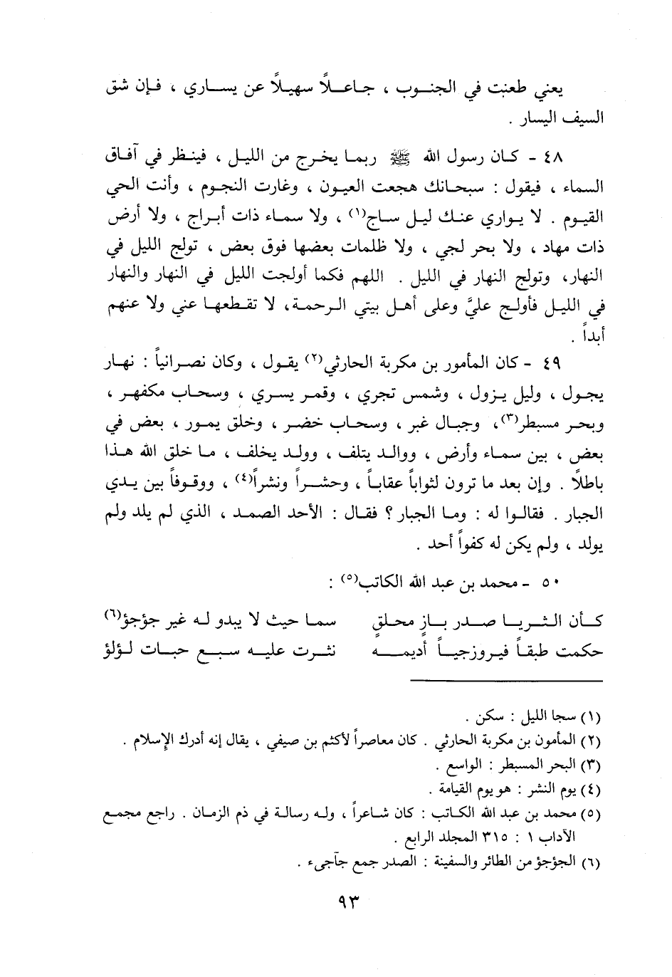 49- كان المأمور بن مكربة الحارثي «2» يقول، وكان نصرانيا: نهار يجول، وليل يزول، وشمس تجري، وقمر يسري، وسحاب مكفهر، وبحر مسبطر «3» ، وجبال غبر، وسحاب خضر، وخلق يمور، بعض في بعض، بين سماء وأرض، ووالد يتلف، وولد يخلف، ما خلق الله هذا باطلا. وإن بعد ما ترون لثوابا عقابا، وحشرا ونشرا «4» ، ووقوفا بين يدي الجبار. فقالوا له: وما الجبار؟ فقال: الأحد الصمد، الذي لم يلد ولم يولد، ولم يكن له كفوا أحد.