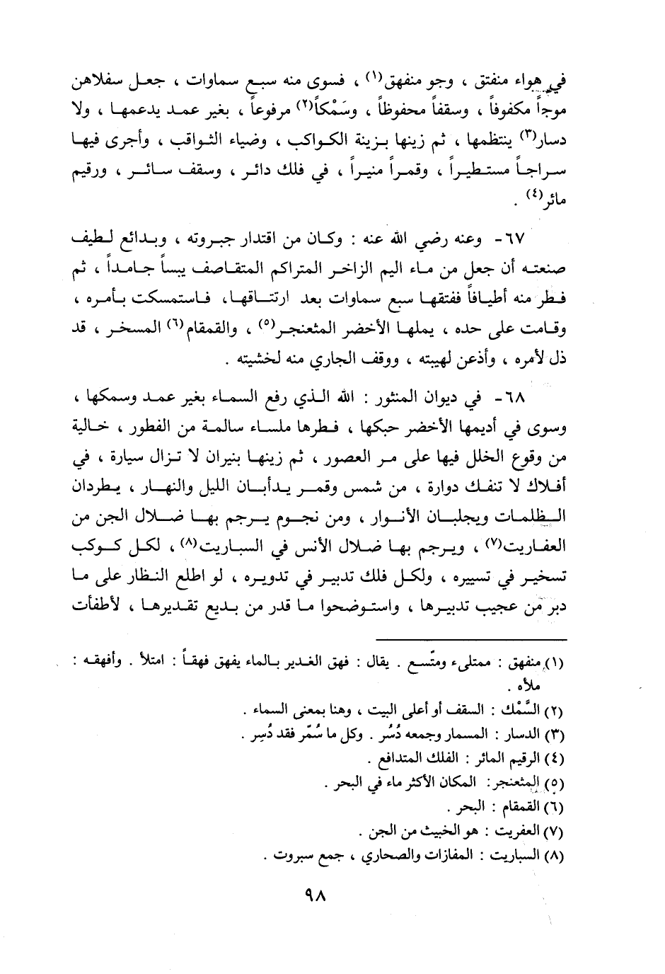 68- في ديوان المنثور: الله الذي رفع السماء بغير عمد وسمكها، وسوى في أديمها الأخضر حبكها، فطرها ملساء سالمة من الفطور، خالية من وقوع الخلل فيها على مر العصور، ثم زينها بنيران لا تزال سيارة، في أفلاك لا تنفك دوارة، من شمس وقمر يدأبان الليل والنهار، يطردان الظلمات ويجلبان الأنوار، ومن نجوم يرجم بها ضلال الجن من العفاريت «7» ، ويرجم بها ضلال الأنس في السباريت «8» ، لكل كوكب تسخير في تسييره، ولكل فلك تدبير في تدويره، لو اطلع النظار على ما دبر من عجيب تدبيرها، واستوضحوا ما قدر من بديع تقديرها، لأطفأت