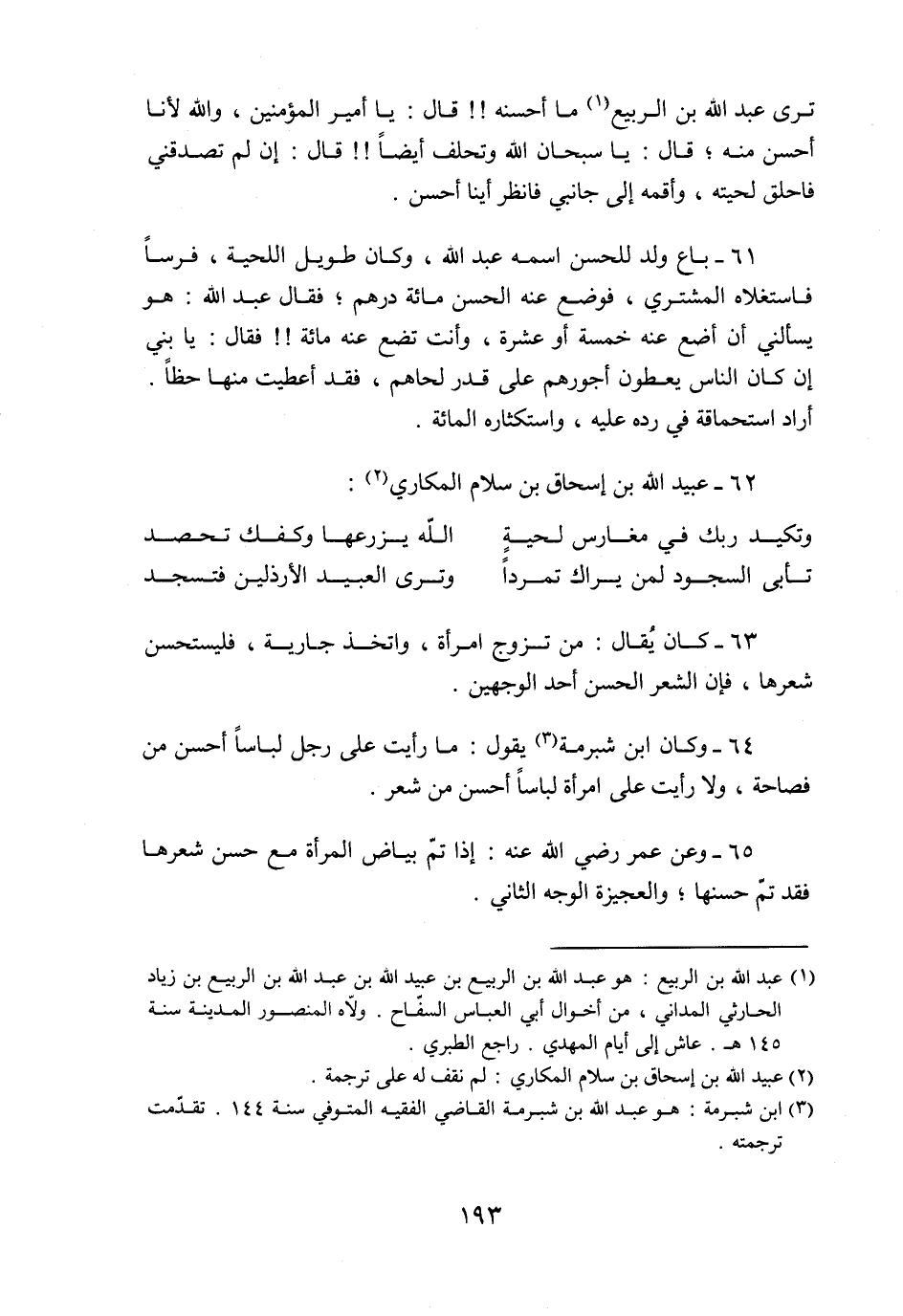 64- وكان ابن شبرمة «3» يقول: ما رأيت على رجل لباسا أحسن من فصاحة، ولا رأيت على امرأة لباسا أحسن من شعر.