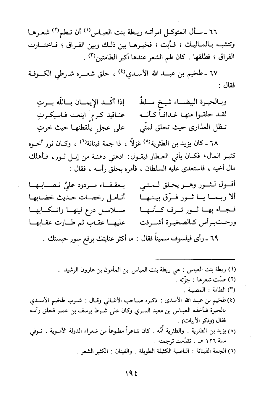 68- كان يزيد بن الطثرية «5» غزلا، ذا جمة فينانة «6» ، وكان ثور أخوه كثير المال، فكان يأتي العطار فيقول: ادهني دهنة من إبل ثور، فأهلك مال أخيه، فاستعدى عليه السلطان، فأمره بحلق رأسه، فقال: