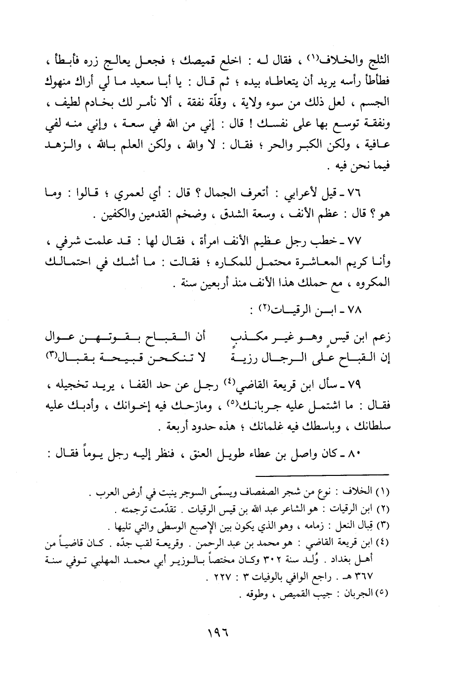 79- سأل ابن قريعة القاضي «4» رجل عن حد القفا، يريد تخجيله، فقال: ما اشتمل عليه جربانك «5» ، ومازحك فيه إخوانك، وأدبك عليه سلطانك، وباسطك فيه غلمانك، هذه حدود أربعة.