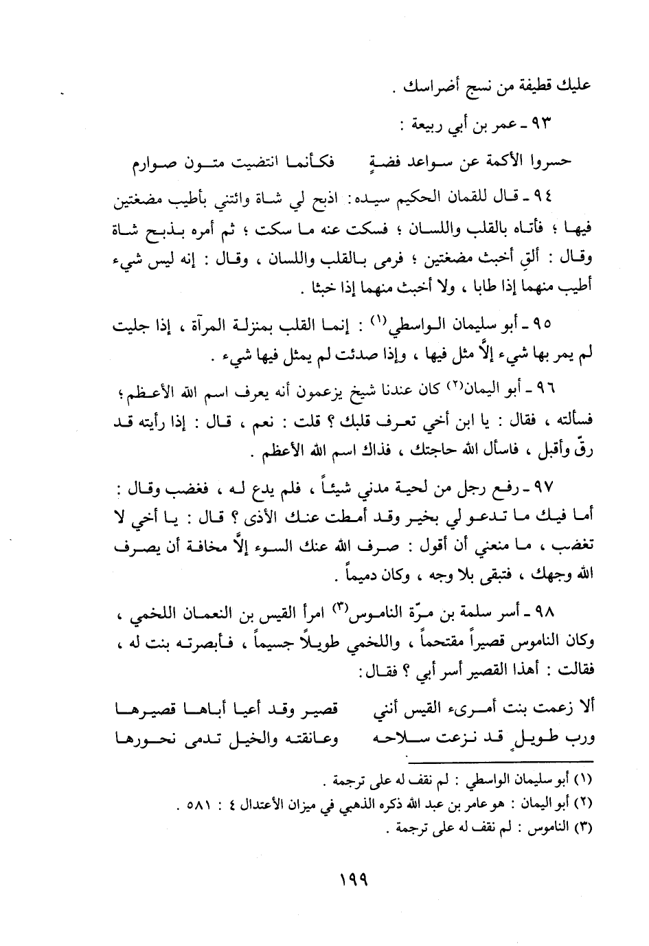 95- أبو سليمان الواسطي «1» : إنما القلب بمنزلة المرآة، إذا جليت لم يمر بها شيء إلّا مثل فيها، وإذا صدئت لم يمثل فيها شيء.