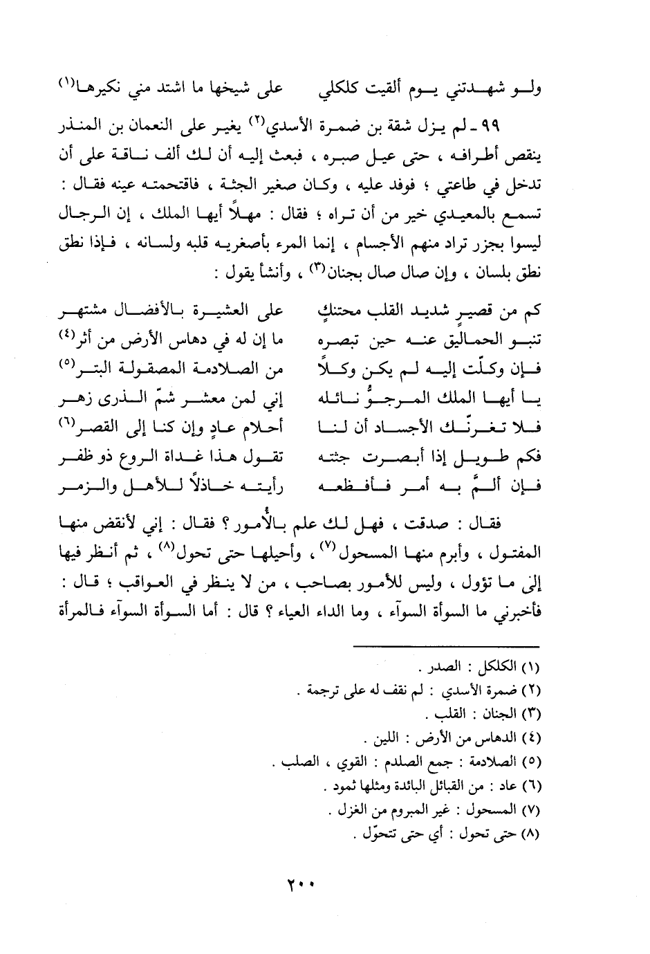 فقال: صدقت، فهل لك علم بالأمور؟ فقال: إني لأنقض منها المفتول، وأبرم منها المسحول «7» ، وأحيلها حتى تحول «8» ، ثم أنظر فيها إلى ما تؤول، وليس للأمور بصاحب، من لا ينظر في العواقب، قال: