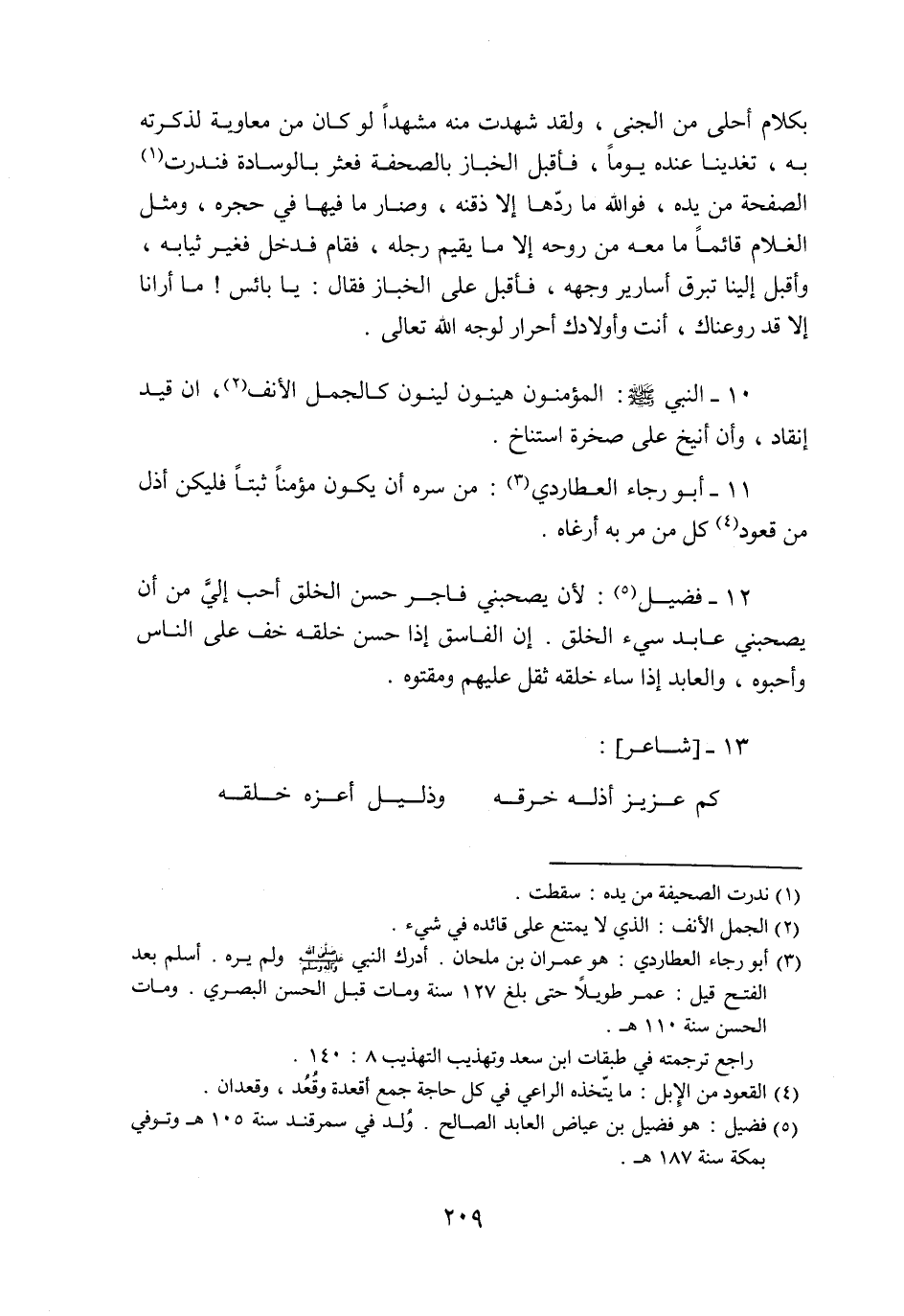 12- فضيل «5» : لأن يصحبني فاجر حسن الخلق أحب إليّ من أن يصحبني عابد سيء الخلق. إن الفاسق إذا حسن خلقه خف على الناس وأحبوه، والعابد إذا ساء خلقه ثقل عليهم ومقتوه.