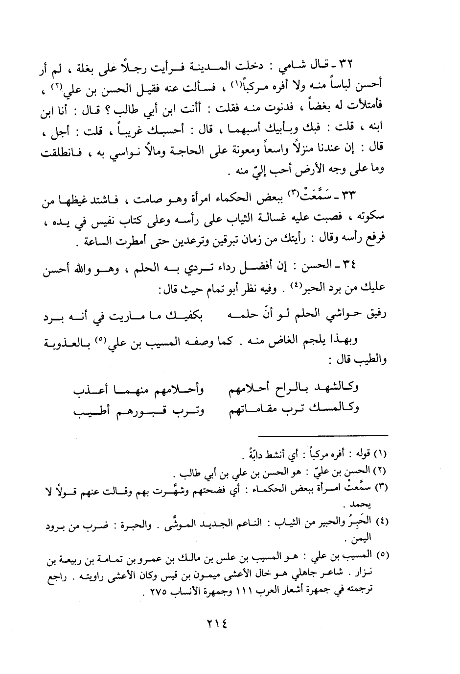 32- قال شامي: دخلت المدينة فرأيت رجلا على بغلة، لم أر أحسن لباسا منه ولا أفره مركبا «1» ، فسألت عنه فقيل الحسن بن علي «2» ، فأمتلأت له بغضا، فدنوت منه فقلت: أأنت ابن أبي طالب؟ قال: أنا ابن ابنه، قلت: فبك وبأبيك أسبهما، قال: أحسبك غريبا، قلت: أجل، قال: إن عندنا منزلا واسعا ومعونة على الحاجة ومالا نواسي به، فانطلقت وما على وجه الأرض أحب إليّ منه.