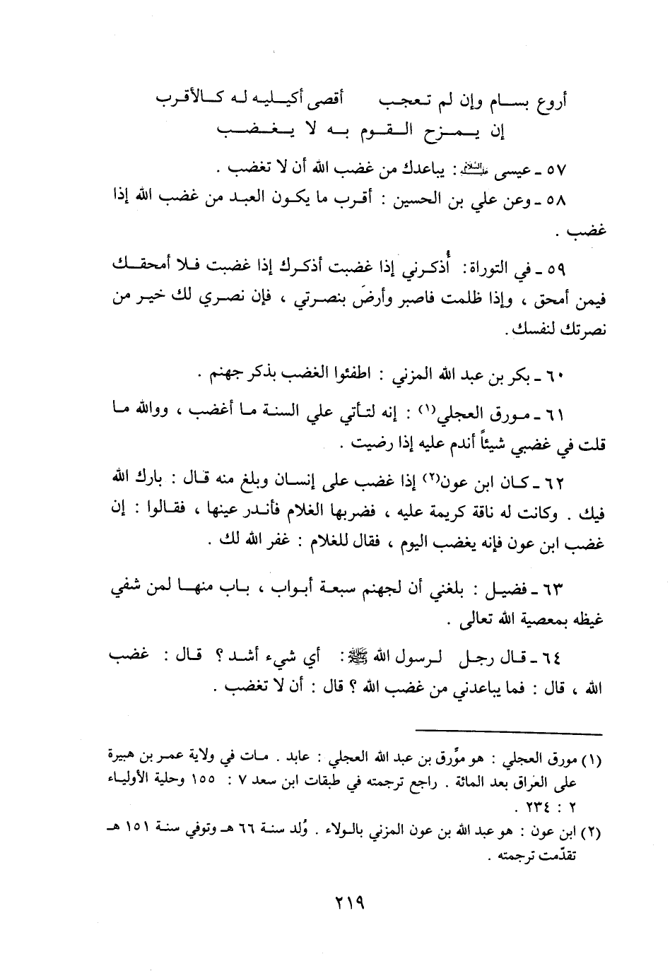 58- وعن علي بن الحسين: أقرب ما يكون العبد من غضب الله إذا غضب.