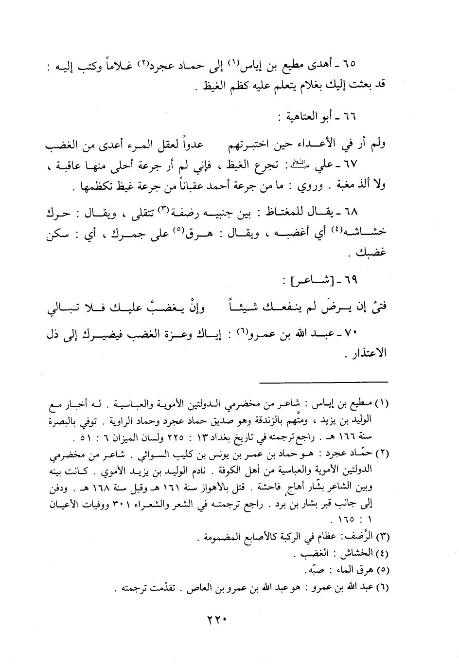 68- يقال للمغتاظ: بين جنبيه رضفة «3» تتقلى، ويقال: حرك خشاشه «4» أي أغضبه، ويقال: هرق «5» على جمرك، أي: سكن غضبك.