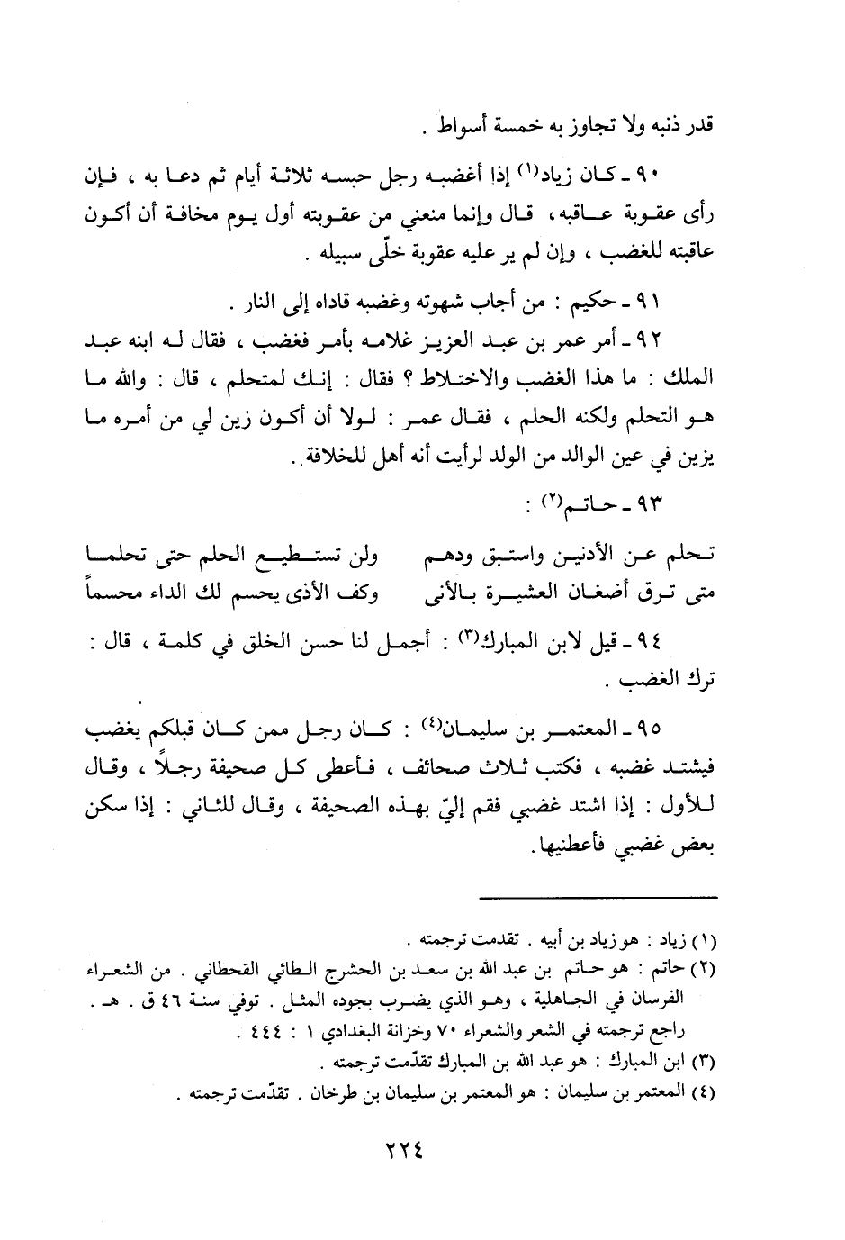 95- المعتمر بن سليمان «4» : كان رجل ممن كان قبلكم يغضب فيشتد غضبه، فكتب ثلاث صحائف، فأعطى كل صحيفة رجلا، وقال للأول: إذا اشتد غضبي فقم إليّ بهذه الصحيفة، وقال للثاني: إذا سكن بعض غضبي فأعطنيها.