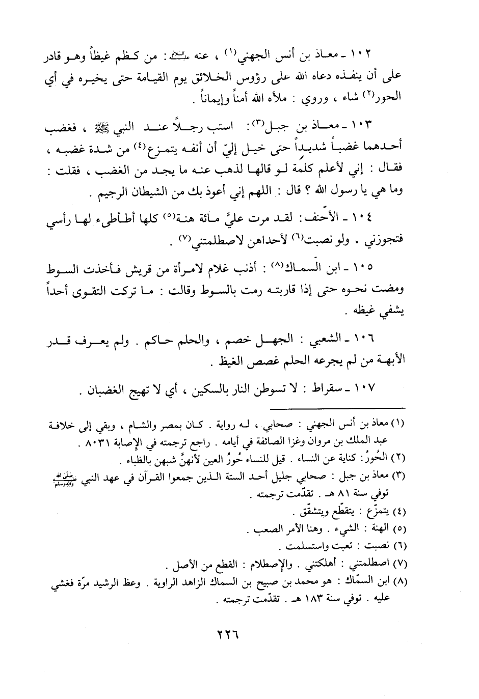 102- معاذ بن أنس الجهني «1» ، عنه عليه السّلام: من كظم غيظا وهو قادر على أن ينفذه دعاه الله على رؤوس الخلائق يوم القيامة حتى يخيره في أي الحور «2» شاء، وروي: ملأه الله أمنا وإيمانا.
