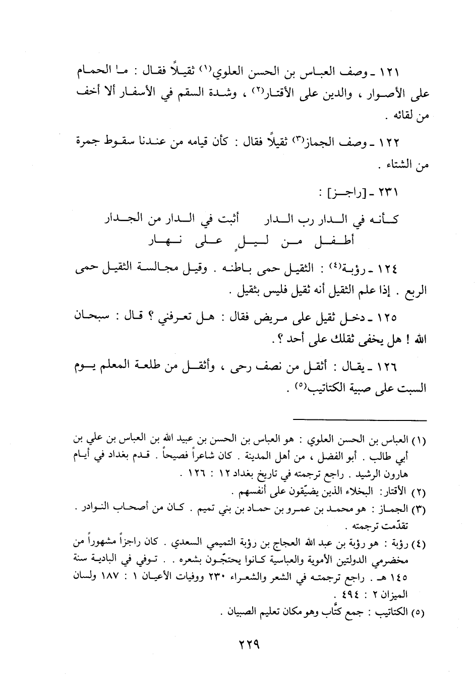 121- وصف العباس بن الحسن العلوي «1» ثقيلا فقال: ما الحمام على الأصوار، والدين على الأقتار «2» ، وشدة السقم في الأسفار ألا أخف من لقائه.