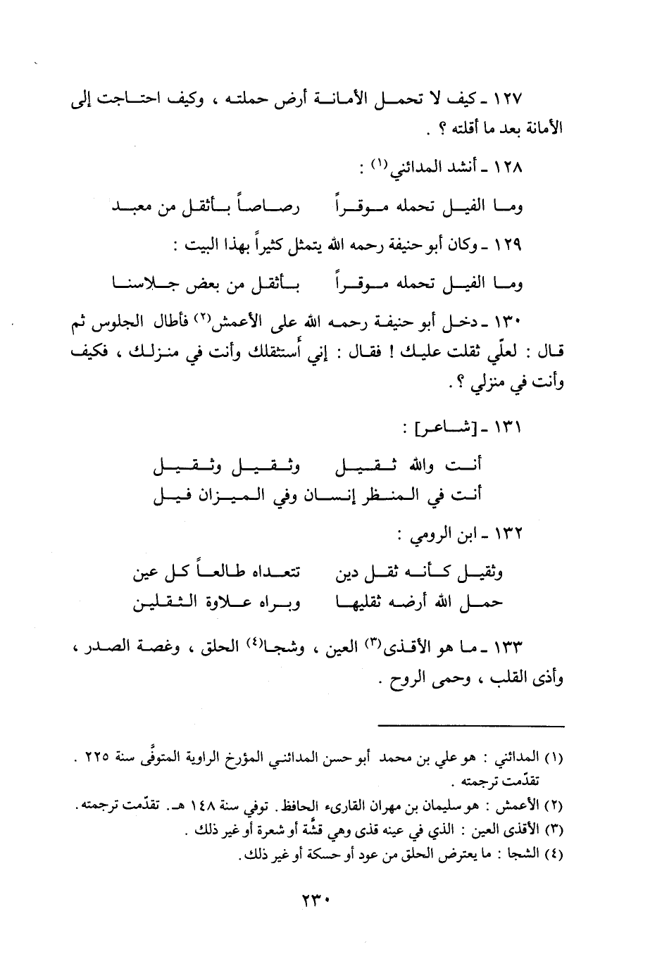130- دخل أبو حنيفة رحمه الله على الأعمش «2» فأطال الجلوس ثم قال: لعلّي ثقلت عليك! فقال: إني أستثقلك وأنت في منزلك، فكيف وأنت في منزلي؟.