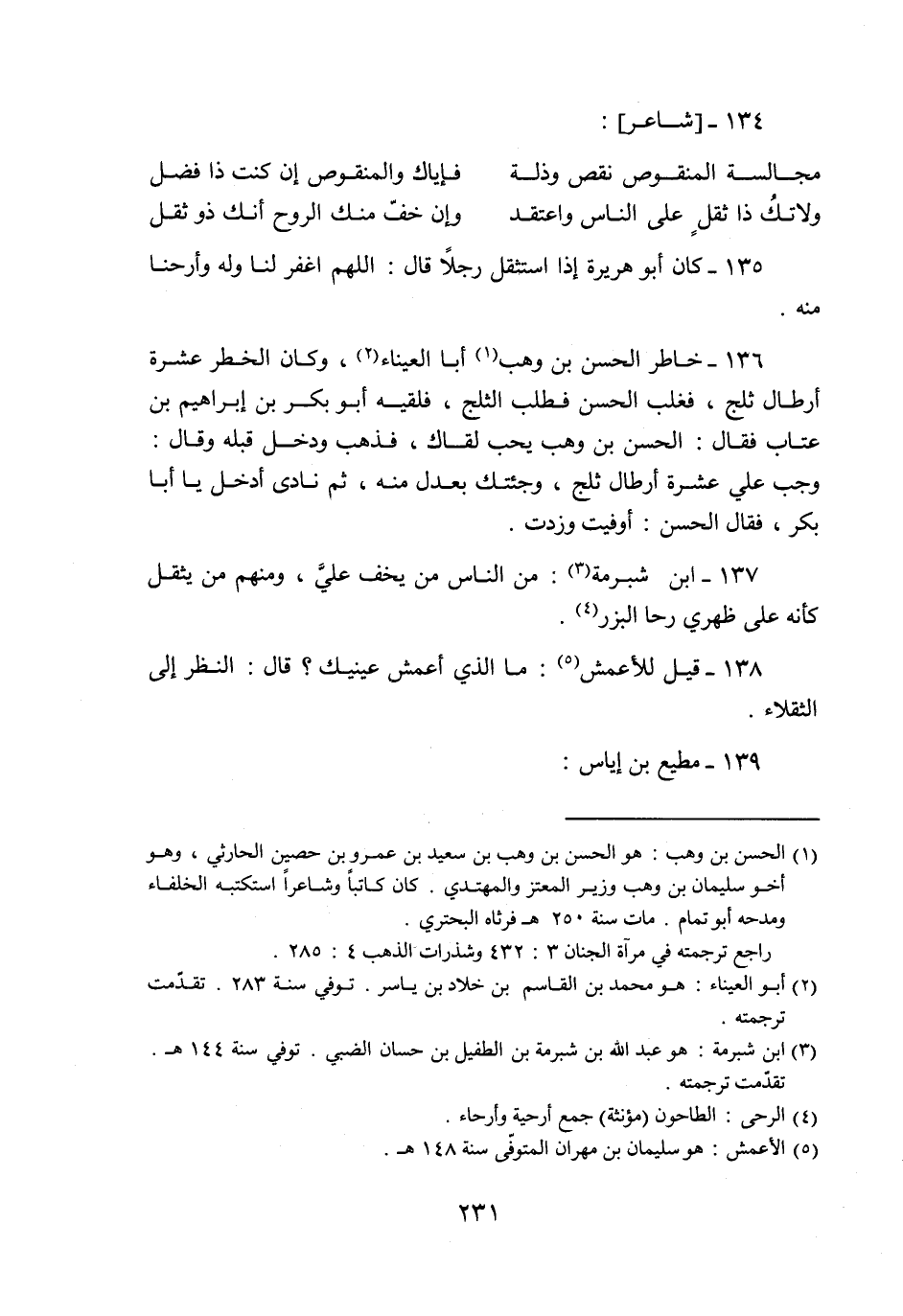 137- ابن شبرمة «3» : من الناس من يخف عليّ، ومنهم من يثقل كأنه على ظهري رحا البزر «4» .