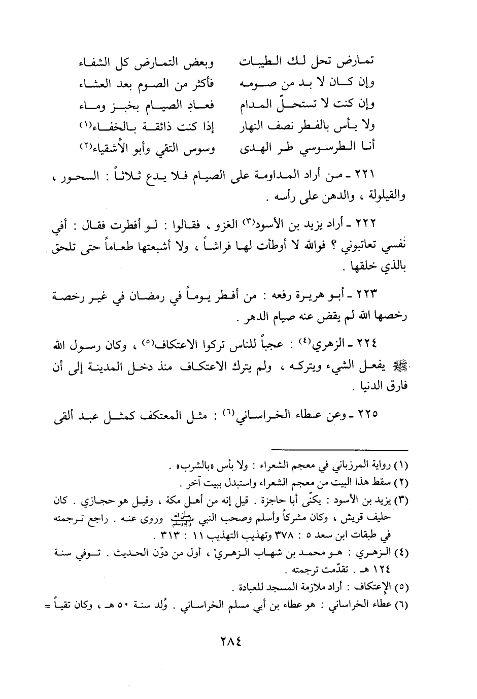 224- الزهري «4» : عجبا للناس تركوا الاعتكاف «5» ، وكان رسول الله صلّى الله عليه وسلّم يفعل الشيء ويتركه، ولم يترك الاعتكاف منذ دخل المدينة إلى أن فارق الدنيا.