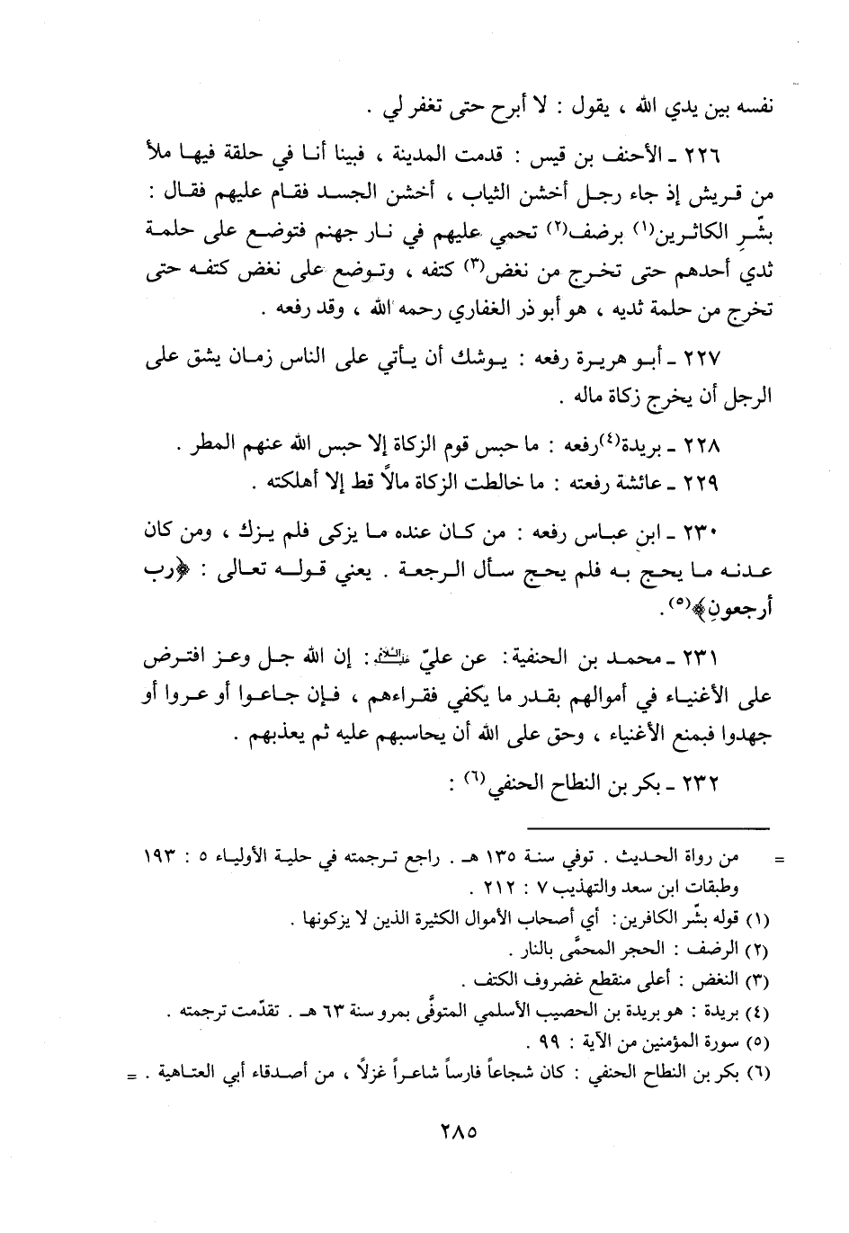 بشّر الكاثرين «1» برضف «2» تحمي عليهم في نار جهنم فتوضع على حلمة ثدي أحدهم حتى تخرج من نغض «3» كتفه، وتوضع على نغض كتفه حتى تخرج من حلمة ثديه، هو أبوذر الغفاري رحمه الله، وقد رفعه.