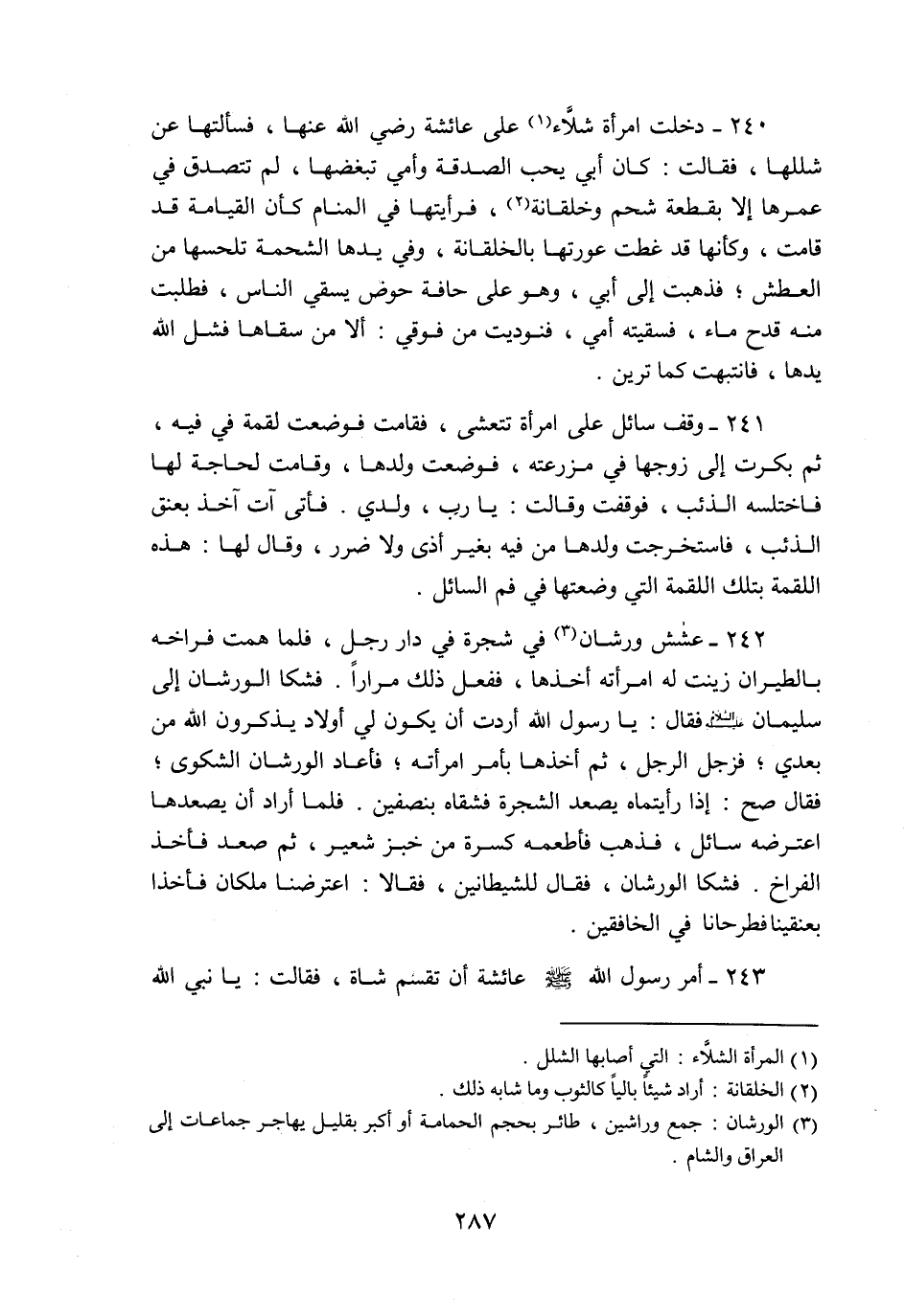 241- وقف سائل على امرأة تتعشى، فقامت فوضعت لقمة في فيه، ثم بكرت إلى زوجها في مزرعته، فوضعت ولدها، وقامت لحاجة لها فاختلسه الذئب، فوقفت وقالت: يا رب، ولدي. فأتى آت آخذ بعنق الذئب، فاستخرجت ولدها من فيه بغير أذى ولا ضرر، وقال لها: هذه اللقمة بتلك اللقمة التي وضعتها في فم السائل.