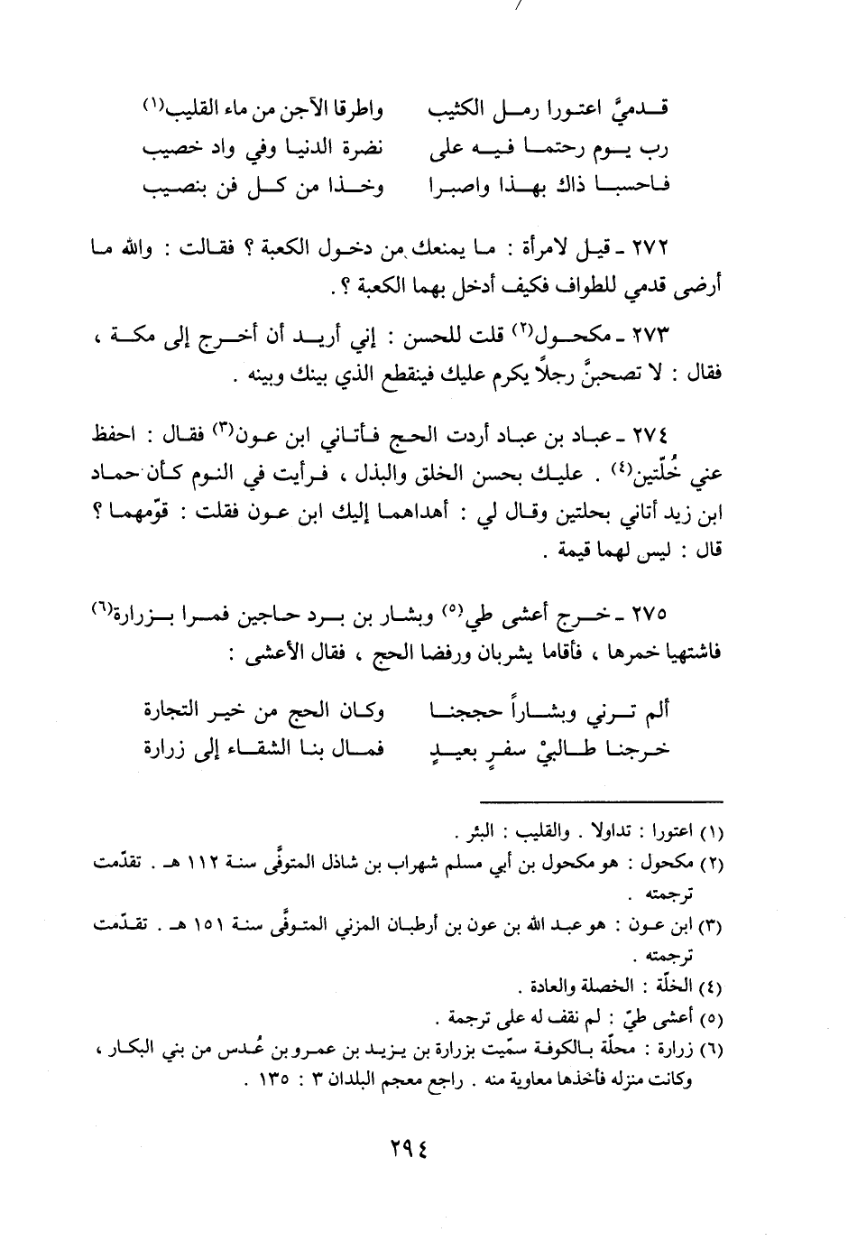 275- خرج أعشى طي «5» وبشار بن برد حاجين فمرا بزرارة «6» فاشتهيا خمرها، فأقاما يشربان ورفضا الحج، فقال الأعشى:
