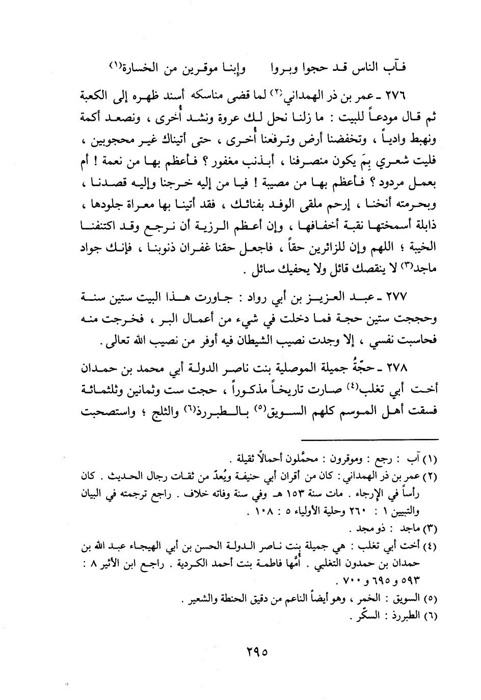 278- حجّة جميلة الموصلية بنت ناصر الدولة أبي محمد بن حمدان أخت أبي تغلب «4» صارت تاريخا مذكورا، حجت ست وثمانين وثلاثمائة فسقت أهل الموسم كلهم السويق «5» بالطبررذ «6» والثلج، واستصحبت