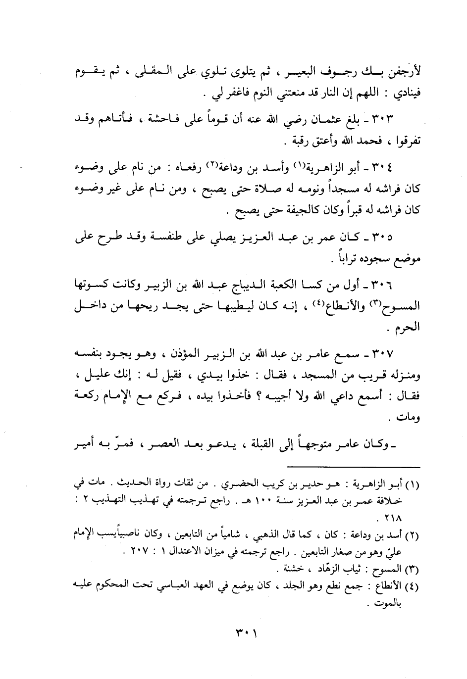305- كان عمر بن عبد العزيز يصلي على طنفسة وقد طرح على موضع سجوده ترابا.