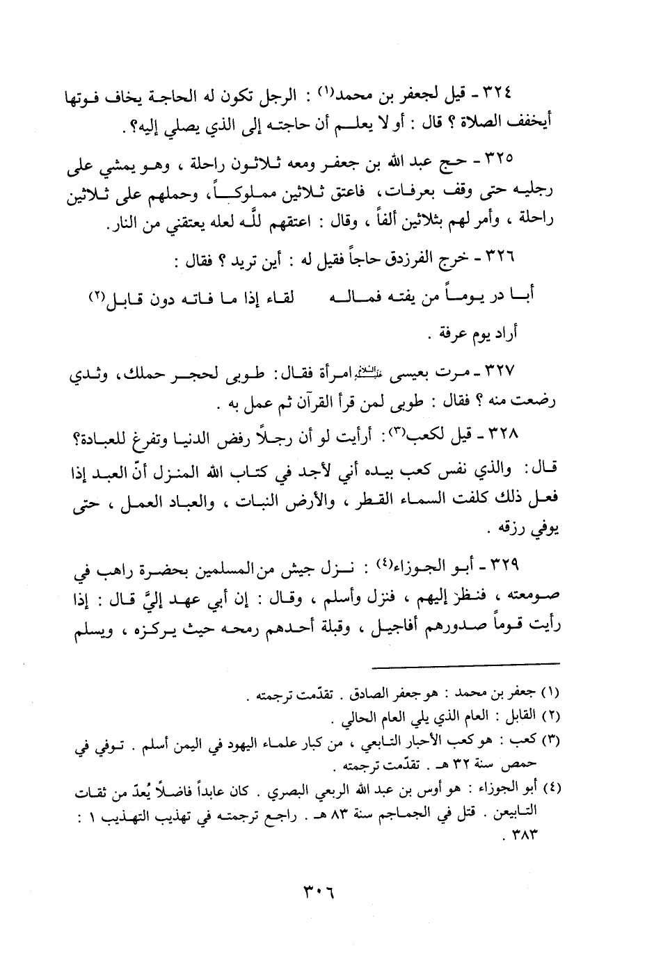 325- حج عبد الله بن جعفر ومعه ثلاثون راحلة، وهو يمشي على رجليه حتى وقف بعرفات، فاعتق ثلاثين مملوكا، وحملهم على ثلاثين راحلة، وأمر لهم بثلاثين ألفا، وقال: اعتقهم لله لعله يعتقني من النار.