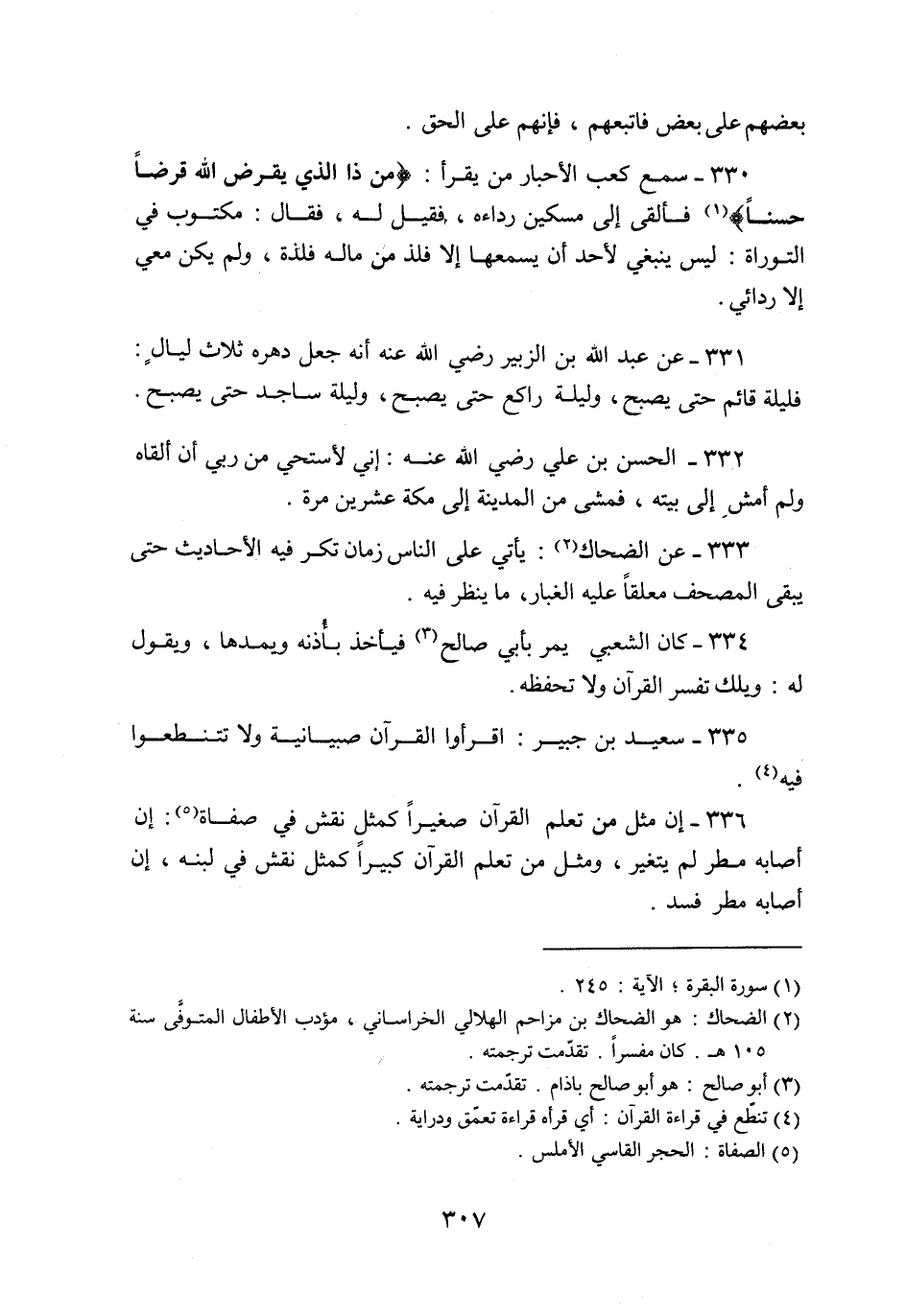 333- عن الضحاك «2» : يأتي على الناس زمان تكر فيه الأحاديث حتى يبقى المصحف معلقا عليه الغبار، ما ينظر فيه.