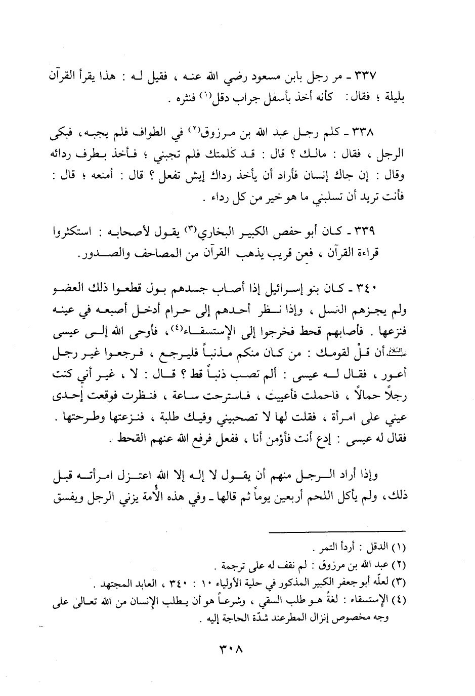 338- كلم رجل عبد الله بن مرزوق «2» في الطواف فلم يجبه، فبكى الرجل، فقال: مالك؟ قال: قد كلمتك فلم تجبني، فأخذ بطرف ردائه وقال: إن جاك إنسان فأراد أن يأخذ رداك إيش تفعل؟ قال: أمنعه، قال: