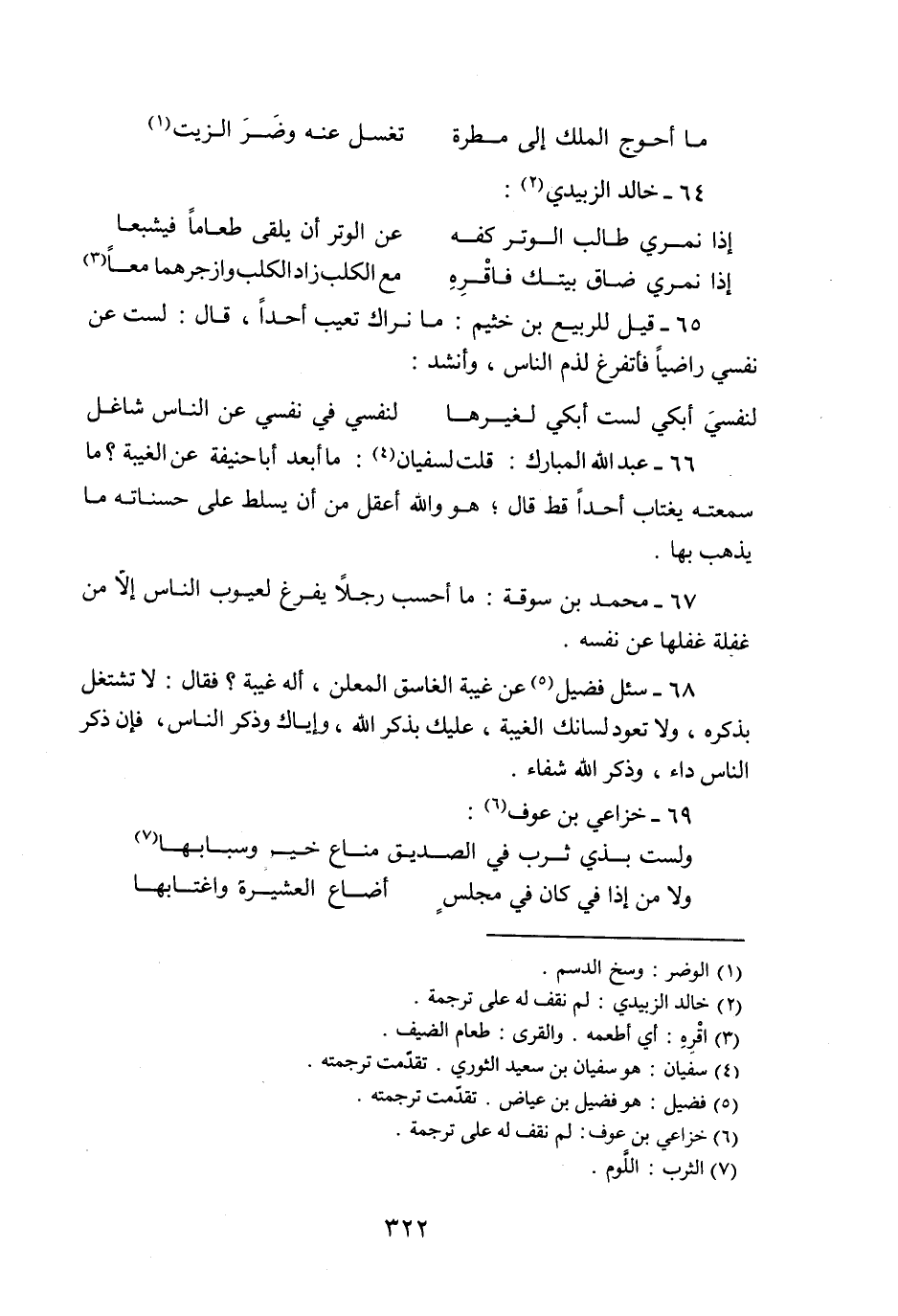 65- قيل للربيع بن خثيم: ما نراك تعيب أحدا، قال: لست عن نفسي راضيا فأتفرغ لذم الناس، وأنشد: