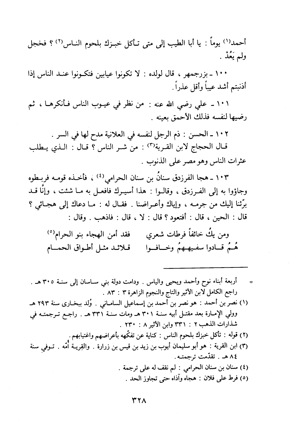 أحمد «1» يوما: يا أبا الطيب إلى متى تأكل خبزك بلحوم الناس «2» ؟ فخجل ولم يعد.