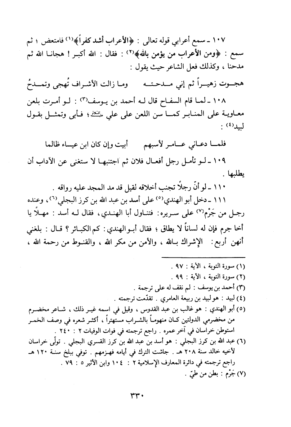 108- لما قام السفاح قال له أحمد بن يوسف «3» : لو أمرت بلعن معاوية على المنابر كما سن اللعن على علي عليه السّلام، فأبى وتمثل بقول لبيد «4» :