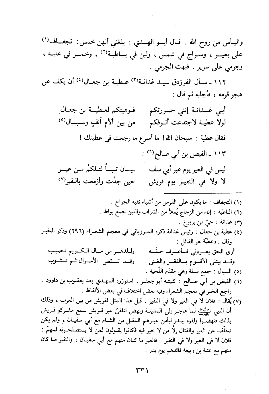 112- سأل الفرزدق سيد غدانة «3» عطية بن جعال «4» أن يكف عن هجو قومه، فأجابه ثم قال: