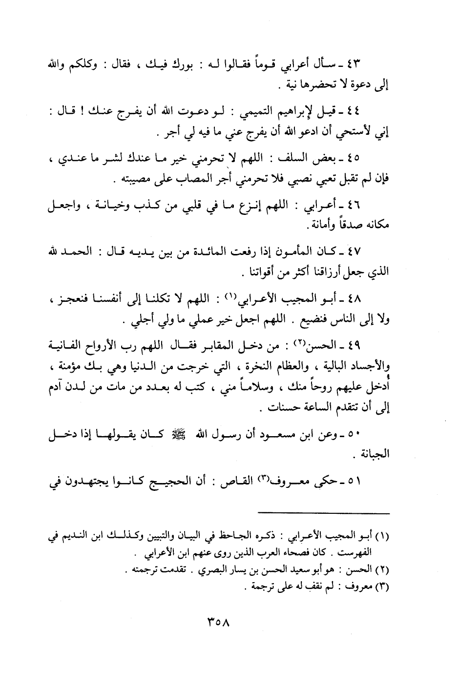 48- أبو المجيب الأعرابي «1» : اللهم لا تكلنا إلى أنفسنا فنعجز، ولا إلى الناس فنضيع. اللهم اجعل خير عملي ما ولي أجلي.