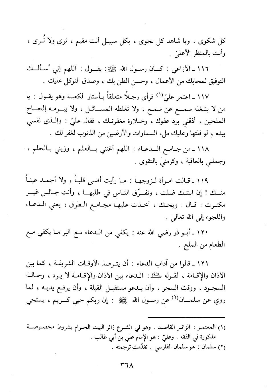 117- اعتمر عليّ «1» فرأى رجلا متعلقا بأستار الكعبة وهو يقول: يا من لا يشغله سمع عن سمع، ولا تغلطه المسائل، ولا يبرمه إلحاح الملحين، أذقني برد عفوك، وحلاوة مغفرتك، فقال عليّ: والذي نفسي بيده، لو قلتها وعليك ملء السماوات والأرضين من الذنوب لغفر لك.