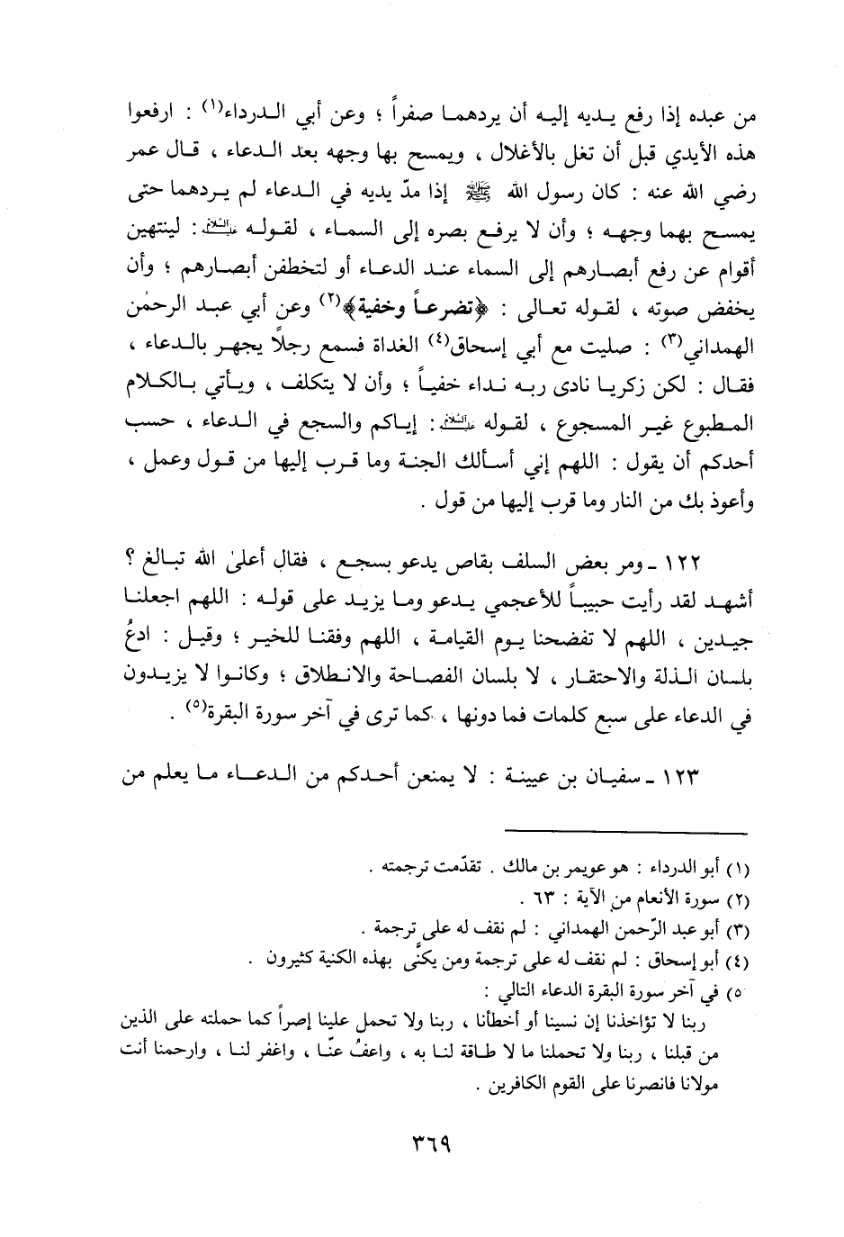 «2» وعن أبي عبد الرحمن الهمداني «3» : صليت مع أبي إسحاق «4» الغداة فسمع رجلا يجهر بالدعاء، فقال: لكن زكريا نادى ربه نداء خفيا، وأن لا يتكلف، ويأتي بالكلام المطبوع غير المسجوع، لقوله عليه السّلام: إياكم والسجع في الدعاء، حسب أحدكم أن يقول: اللهم إني أسألك الجنة وما قرب إليها من قول وعمل، وأعوذ بك من النار وما قرب إليها من قول.