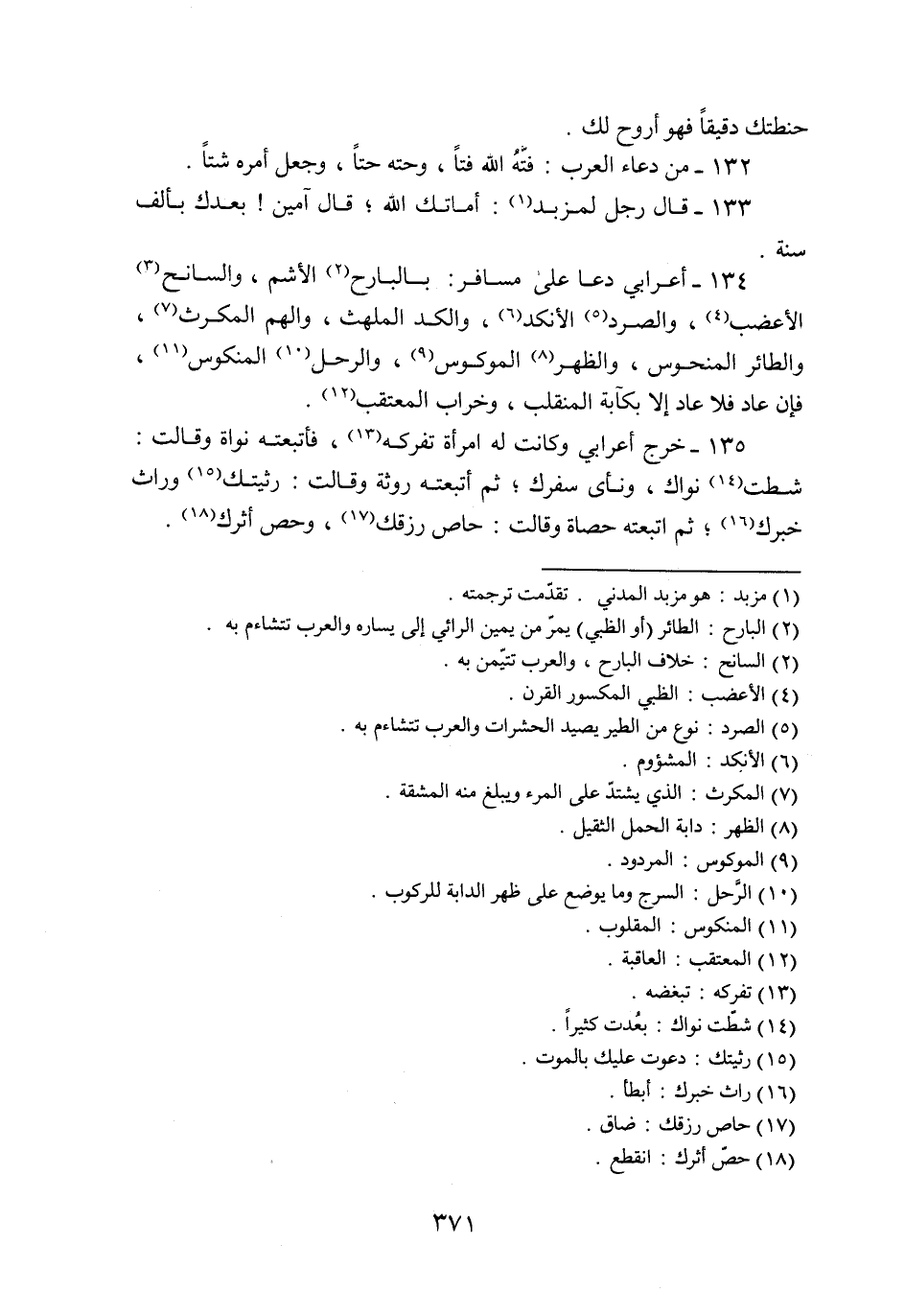 134- أعرابي دعا على مسافر: بالبارح «2» الأشم، والسانح «3» الأعضب «4» ، والصرد «5» الأنكد «6» ، والكد الملهث، والهم المكرث «7» ، والطائر المنحوس، والظهر «8» الموكوس «9» ، والرحل «10» المنكوس «11» ، فإن عاد فلا عاد إلا بكآبة المنقلب، وخراب المعتقب «12» .