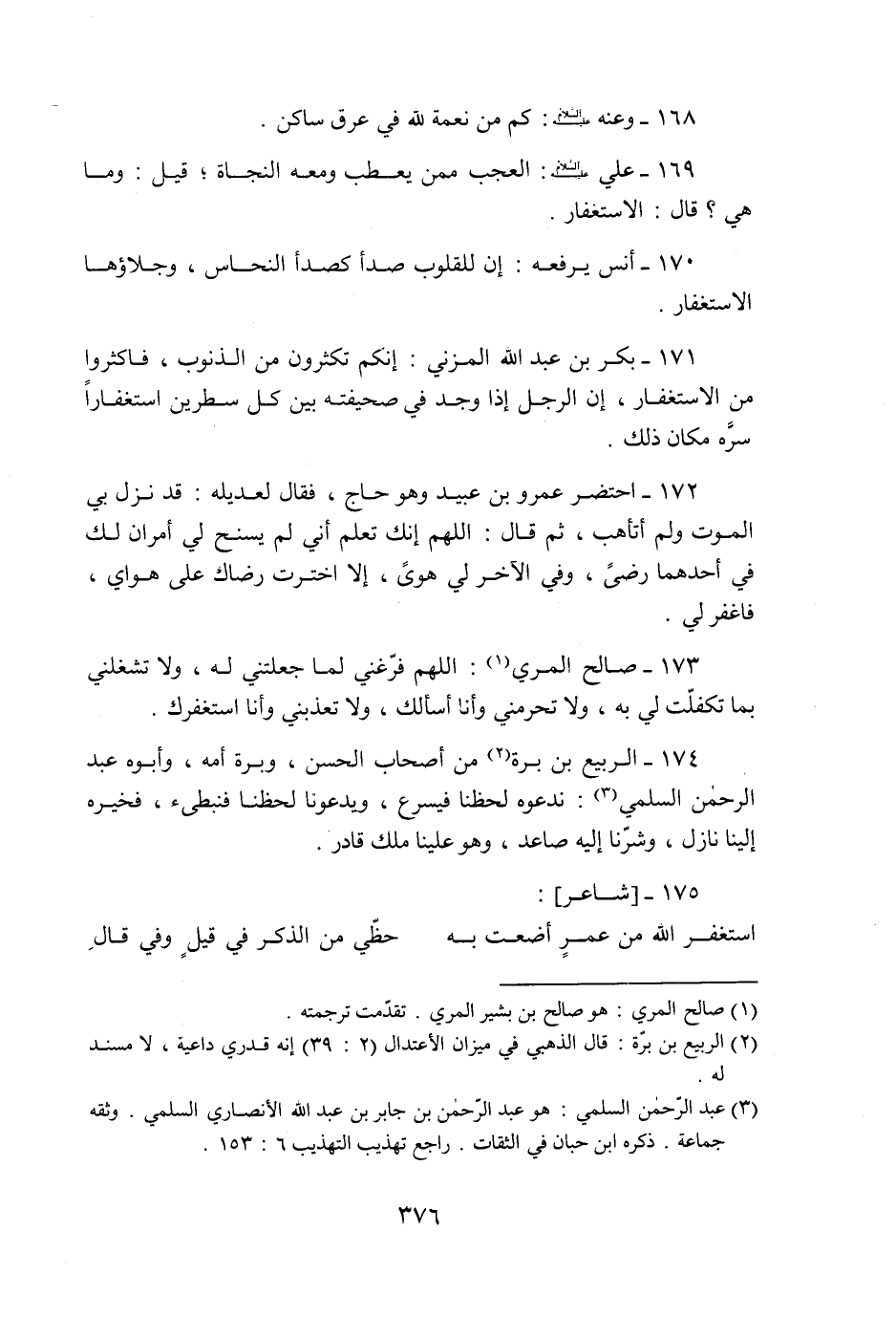 171- بكر بن عبد الله المزني: إنكم تكثرون من الذنوب، فاكثروا من الاستغفار، إن الرجل إذا وجد في صحيفته بين كل سطرين استغفارا سرّه مكان ذلك.