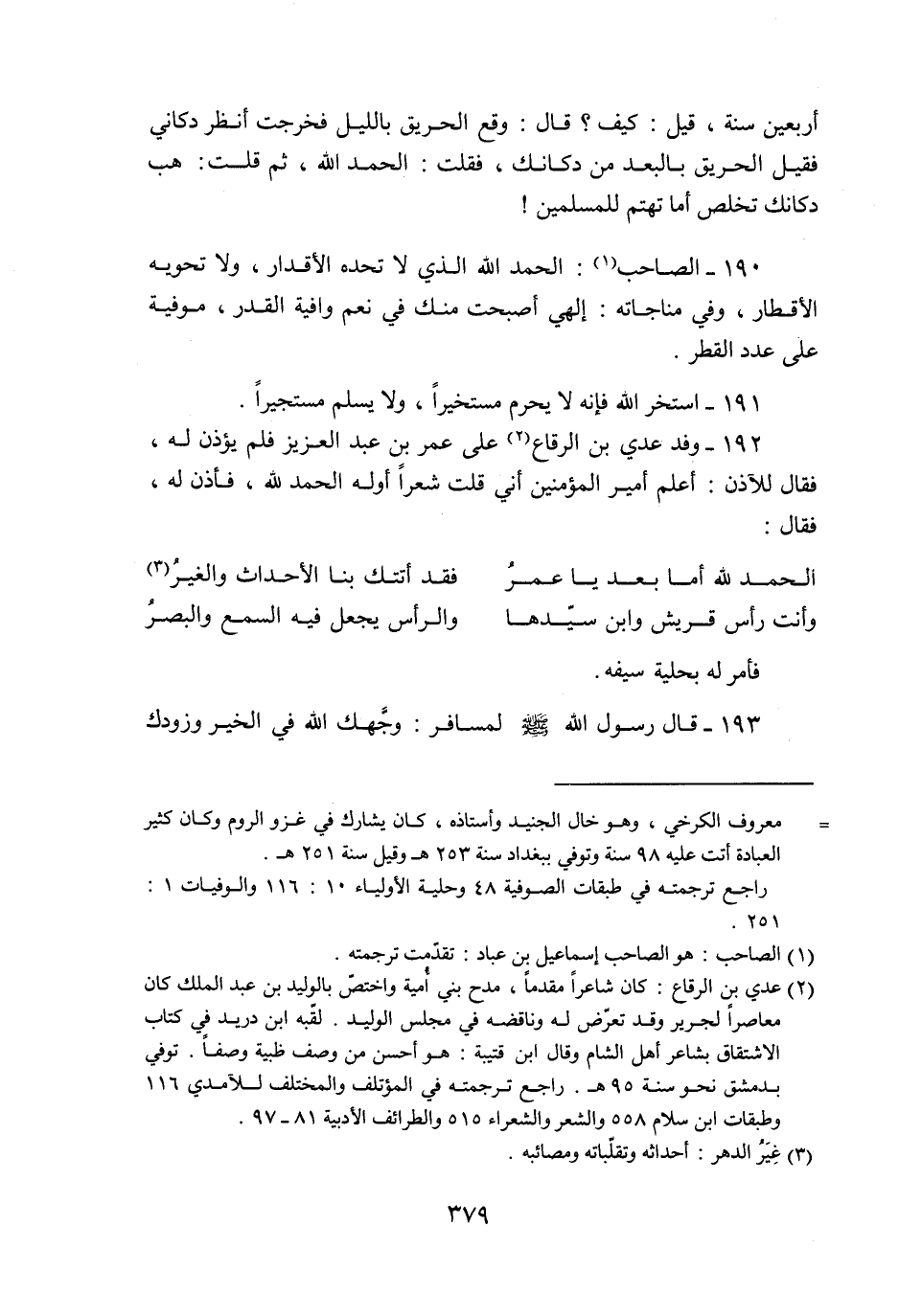 أربعين سنة، قيل: كيف؟ قال: وقع الحريق بالليل فخرجت أنظر دكاني فقيل الحريق بالبعد من دكانك، فقلت: الحمد الله، ثم قلت: هب دكانك تخلص أما تهتم للمسلمين! 190- الصاحب «1» : الحمد الله الذي لا تحده الأقدار، ولا تحويه الأقطار، وفي مناجاته: إلهي أصبحت منك في نعم وافية القدر، موفية على عدد القطر.