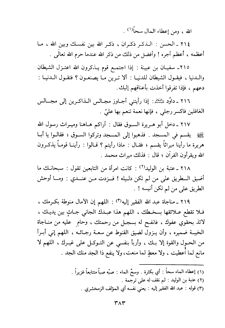215- سفيان بن عيينة: إذا اجتمع قوم يذكرون الله اعتزل الشيطان والدنيا، فيقول الشيطان للدنيا: ألا ترين ما يصنعون؟ فتقول الدنيا: