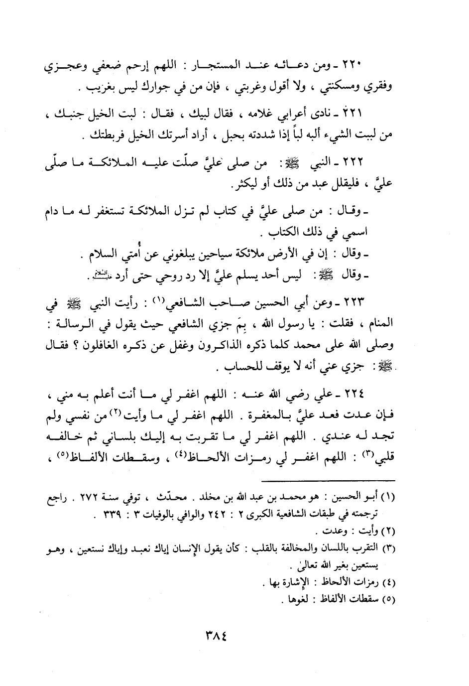 223- وعن أبي الحسين صاحب الشافعي «1» : رأيت النبي صلّى الله عليه وسلّم في المنام، فقلت: يا رسول الله، بم جزي الشافعي حيث يقول في الرسالة: