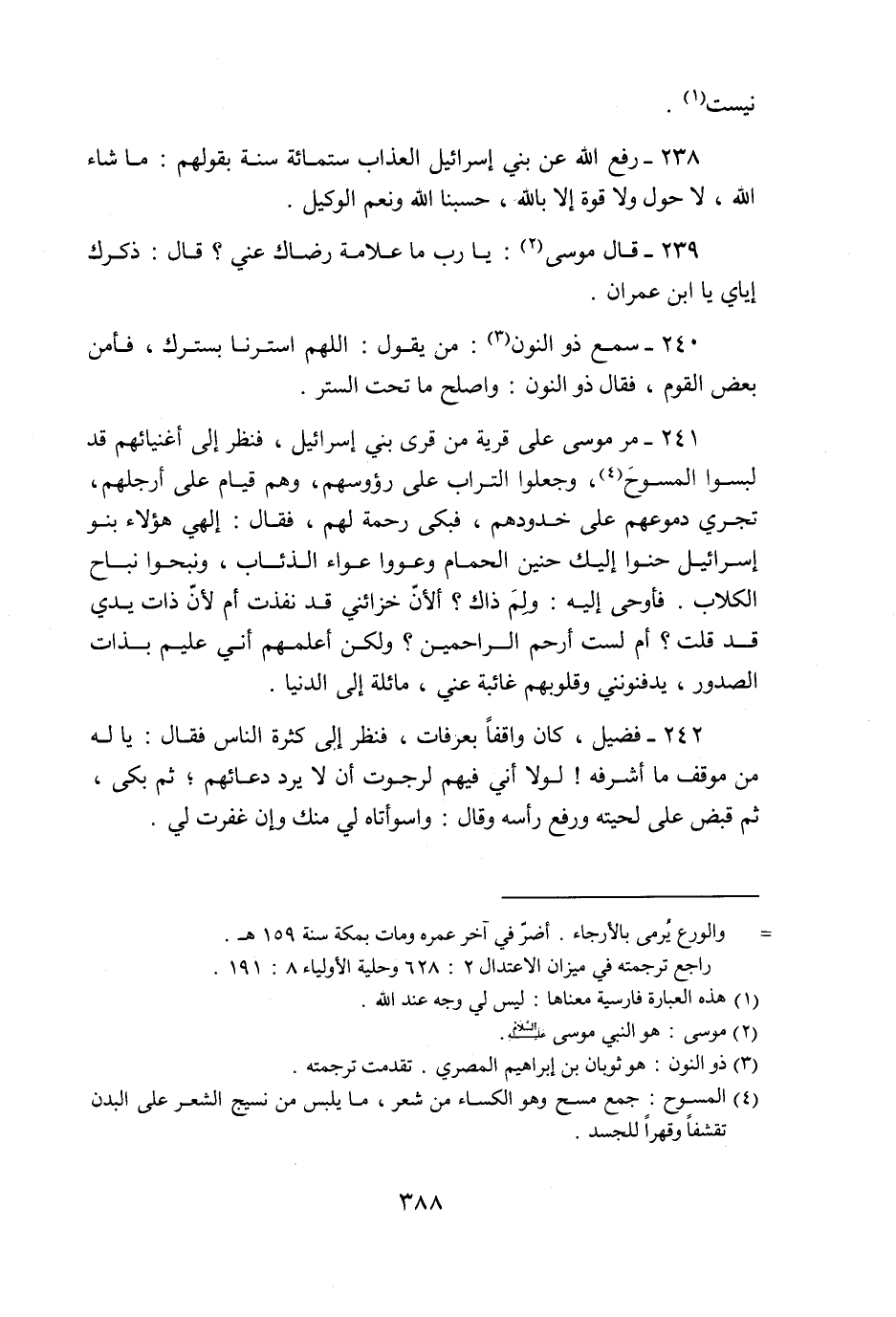 241- مر موسى على قرية من قرى بني إسرائيل، فنظر إلى أغنيائهم قد لبسوا المسوح «4» ، وجعلوا التراب على رؤوسهم، وهم قيام على أرجلهم، تجري دموعهم على خدودهم، فبكى رحمة لهم، فقال: إلهي هؤلاء بنو إسرائيل حنوا إليك حنين الحمام وعووا عواء الذئاب، ونبحوا نباح الكلاب. فأوحى إليه: ولم ذاك؟ ألأنّ خزائني قد نفذت أم لأنّ ذات يدي قد قلت؟ أم لست أرحم الراحمين؟ ولكن أعلمهم أني عليم بذات الصدور، يدفنونني وقلوبهم غائبة عني، مائلة إلى الدنيا.