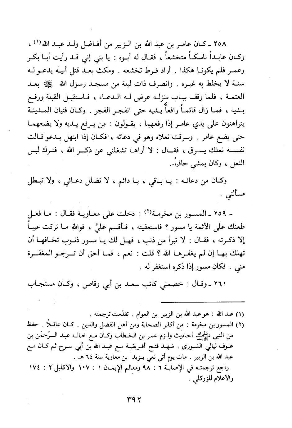 258- كان عامر بن عبد الله بن الزبير من أفاضل ولد عبد الله «1» ، وكان عابدا ناسكا متخشعا، فقال له أبوه: يا بني إني قد رأيت أبا بكر وعمر فلم يكونا هكذا. أراد فرط تخشعه. ومكث بعد قتل أبيه يدعو له سنة لا يخلط به غيره. وانصرف ذات ليلة من مسجد رسول الله صلّى الله عليه وسلّم بعد العتمة، فلما وقف بباب منزله عرض له الدعاء، فاستقبل القبلة ورفع يديه، فما زال قائما رافعا يديه حتى انفجر الفجر. وكان فتيان المدينة يتراهنون على يدي عامر إذا رفعهما، يقولون: من يرفع يديه ولا يضعهما حتى يضع عامر. وسرقت نعلاه وهو في دعائه، فكان إذا ابتهل يدعو قالت نفسه نعلك يسرق، فقال: لا أراها تشغلني عن ذكر الله، فترك لبس النعل، وكان يمشي حافيا.