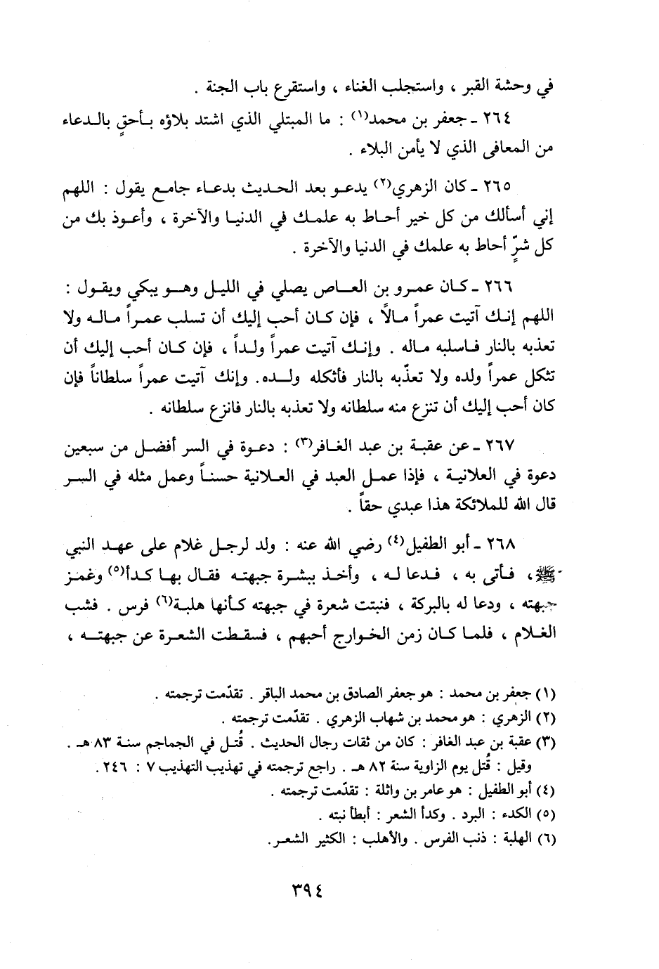 264- جعفر بن محمد «1» : ما المبتلي الذي اشتد بلاؤه بأحق بالدعاء من المعافى الذي لا يأمن البلاء.