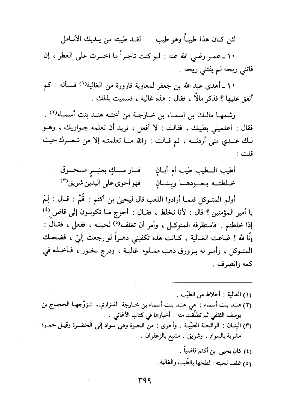 11- أهدى عبد الله بن جعفر لمعاوية قارورة من الغالية «1» فسأله: كم أنفق عليها؟ فذكر مالا، فقال: هذه غالية، فسميت بذلك.