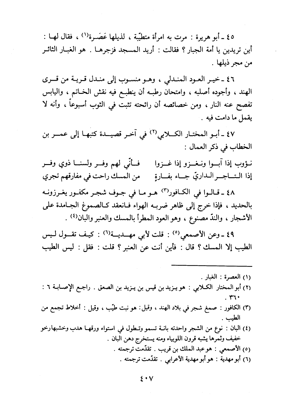 49- وعن الأصمعي «5» : قلت لأبي مهدية «6» : كيف تقول ليس الطيب إلا المسك؟ قال: فأين أنت عن العنبر؟ قلت: فقل: ليس الطيب