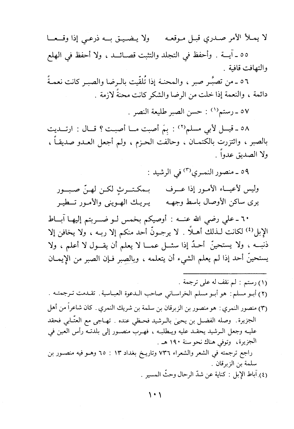 58- قيل لأبي مسلم «2» : بم أصبت ما أصبت؟ قال: ارتديت بالصبر، وائتزرت بالكتمان، وحالفت الحزم، ولم أجعل العدو صديقا، ولا الصديق عدوا.