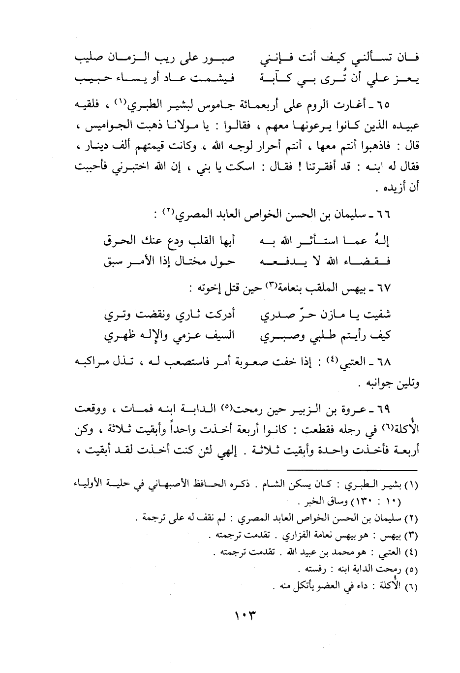 65- أغارت الروم على أربعمائة جاموس لبشير الطبري «1» ، فلقيه عبيدة الذين كانوا يرعونها معهم، فقالوا: يا مولانا ذهبت الجواميس، قال: فاذهبوا أنتم معها، أنتم أحرار لوجه الله، وكانت قيمتهم ألف دينار، فقال له ابنه: قد أفقرتنا! فقال: اسكت يا بني، إن الله اختبرني فأحببت أن أزيده.