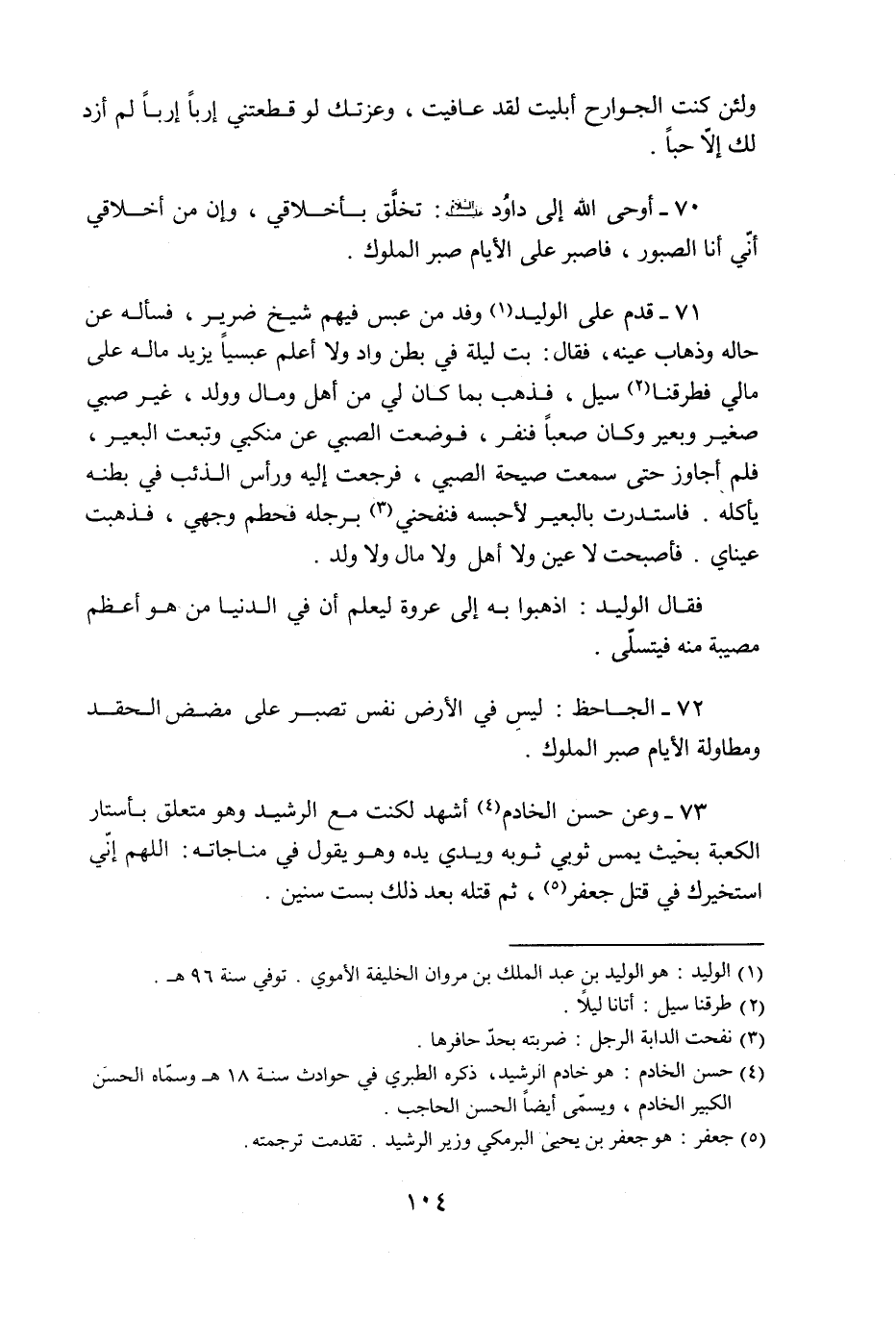 70- أوحى الله إلى داود عليه السّلام: تخلّق بأخلاقي، وإن من أخلاقي أنّي أنا الصبور، فاصبر على الأيام صبر الملوك.